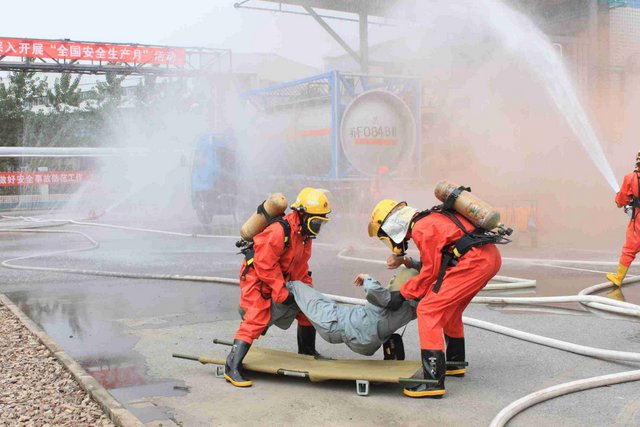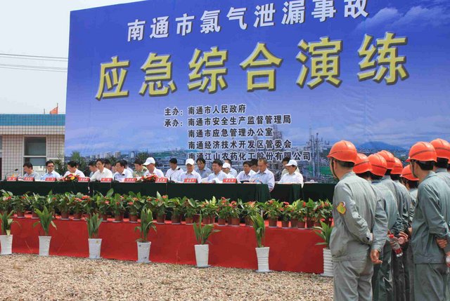 6月21日上午,9時40分,江山股份氯氣站一輛裝有20噸液氯的槽罐車在接卸液氯作業(yè)時,管道“發(fā)生”氯氣泄漏,氯氣向周邊擴散,影響了附近企業(yè)和居民的人身安全……這是南通市氯氣泄漏事故應(yīng)急綜合演練中的一幕。 由市政府主辦、江山股份承辦的南通市氯氣泄漏事故應(yīng)急綜合演練是2012年南通市安全生產(chǎn)月的“重頭戲”, 此次應(yīng)急演練重在提高政府、職能部門、企業(yè)應(yīng)對危險化學品事故的應(yīng)急處置能力,最大限度減少因安全生產(chǎn)事故給企業(yè)和人民群眾造成的財產(chǎn)損失和人員傷亡。 由于氯氣是具有刺激性氣味的有毒氣體,可以溶解于水,因此應(yīng)急處理主要是通過噴灑形成水霧的方法來降低氯氣濃度,控制擴散范圍。現(xiàn)場用紅色煙霧代替黃綠色氯氣。演練中,市安監(jiān)、公安、消防、環(huán)保、質(zhì)監(jiān)、衛(wèi)生、氣象等部門積極聯(lián)動,各司其職,氣象部門提供風力、溫度、濕度等實時數(shù)據(jù),環(huán)保部門負責空氣中氯氣含量檢測,公安負責交通管制和疏散救援……僅用了不到40分鐘即圓滿完成了泄漏源堵漏和周邊企業(yè)及居民的疏散工作,充分展示并檢驗了市政府、職能部門及企業(yè)應(yīng)對危險化學品事故的應(yīng)急處置能力。 副市長徐輝擔任現(xiàn)場總指揮,并對演練做了綜合點評。江山股份董事長李大軍觀摩現(xiàn)場演練,總經(jīng)理薛健任現(xiàn)場副指揮。
