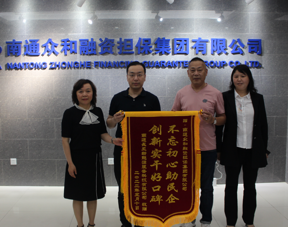近日,眾和擔(dān)保收到一面來自南通長風(fēng)新能源裝備科技有限公司送來的印有“不忘初心助民企,創(chuàng)新實(shí)干好口碑”的答謝錦旗,對我司提供暖心、貼心的擔(dān)保“及時(shí)雨”表示誠摯感謝。